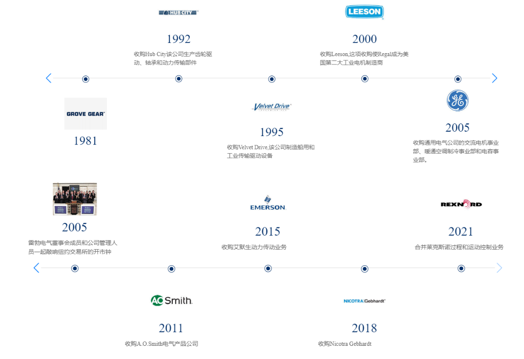 雷勃自1955年以來(lái)成功完成的69項(xiàng)收購(gòu),這些并購(gòu)使公司進(jìn)入動(dòng)力傳動(dòng)、電機(jī)、發(fā)電機(jī)和控制等領(lǐng)域。集團(tuán)的規(guī)模與產(chǎn)能在經(jīng)過(guò)幾輪大型收購(gòu)之后有了極大的提升,到2004年底,我們的年銷(xiāo)售額達(dá)到了7.56億美元。2005年,我們?cè)诩~約股票交易所(股票代碼:NYSE)成功上市。2021年10月,雷科達(dá)電氣(原雷勃電氣)與萊克斯諾PMC單元正式合并,新公司更名為Regal Rexnord電氣集團(tuán),繼續(xù)在紐交所交易,股票代碼變更為:RRX。2021年銷(xiāo)售額達(dá)到48億美元。截止目前,Regal Rexnord電氣集團(tuán)主要產(chǎn)品有電機(jī)、發(fā)電機(jī)、齒輪驅(qū)動(dòng)、控制器等。在電力、冶金、港口機(jī)械、水利、石化、設(shè)備制造、環(huán)保及水處理、食品加工、動(dòng)力發(fā)電、工業(yè)制冷、采礦等各個(gè)領(lǐng)域提供各種靈活的、可定制的診斷和監(jiān)控解決方案,幫助客戶(hù)提高性能,提高設(shè)備可靠性,并實(shí)現(xiàn)較低的成本。